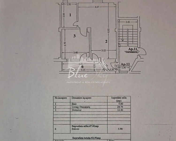 Suprafața totală este de 52,91 mp, din care balconul de 5,90 mp completează armonios zona de relaxare. Compartimentarea permite o utilizare eficientă a fiecărui metru pătrat, oferind lumină naturală și o atmosferă plăcută.
