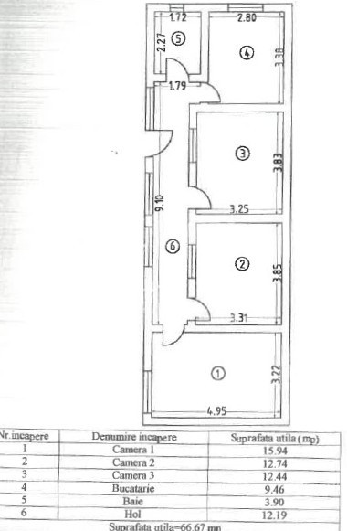 Casa cu suprafata utila 66.67 mp compartimentata in 3 camere, baie, bucatarie si hol.